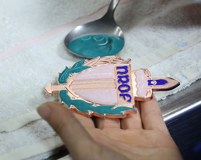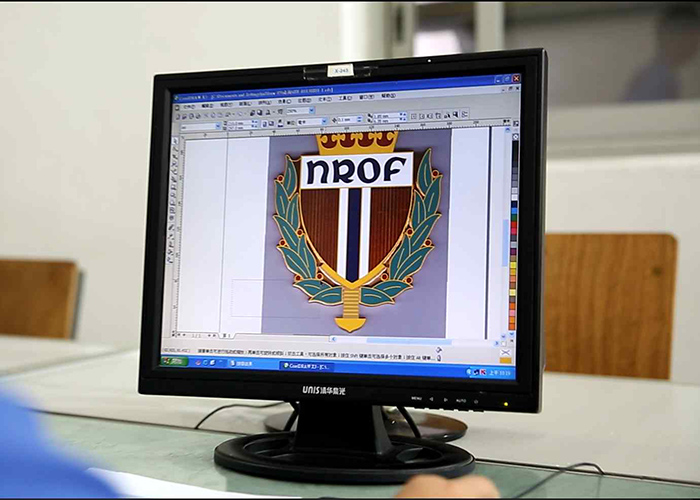 真琺瑯徽章定制流程:客戶咨詢---溝通尺寸細節(jié)---下單---制圖---曬版---咬版---刻模---切模---沖壓---上色---燒制---磨石---修補---拋光---焊配件---電鍍---品檢---成品